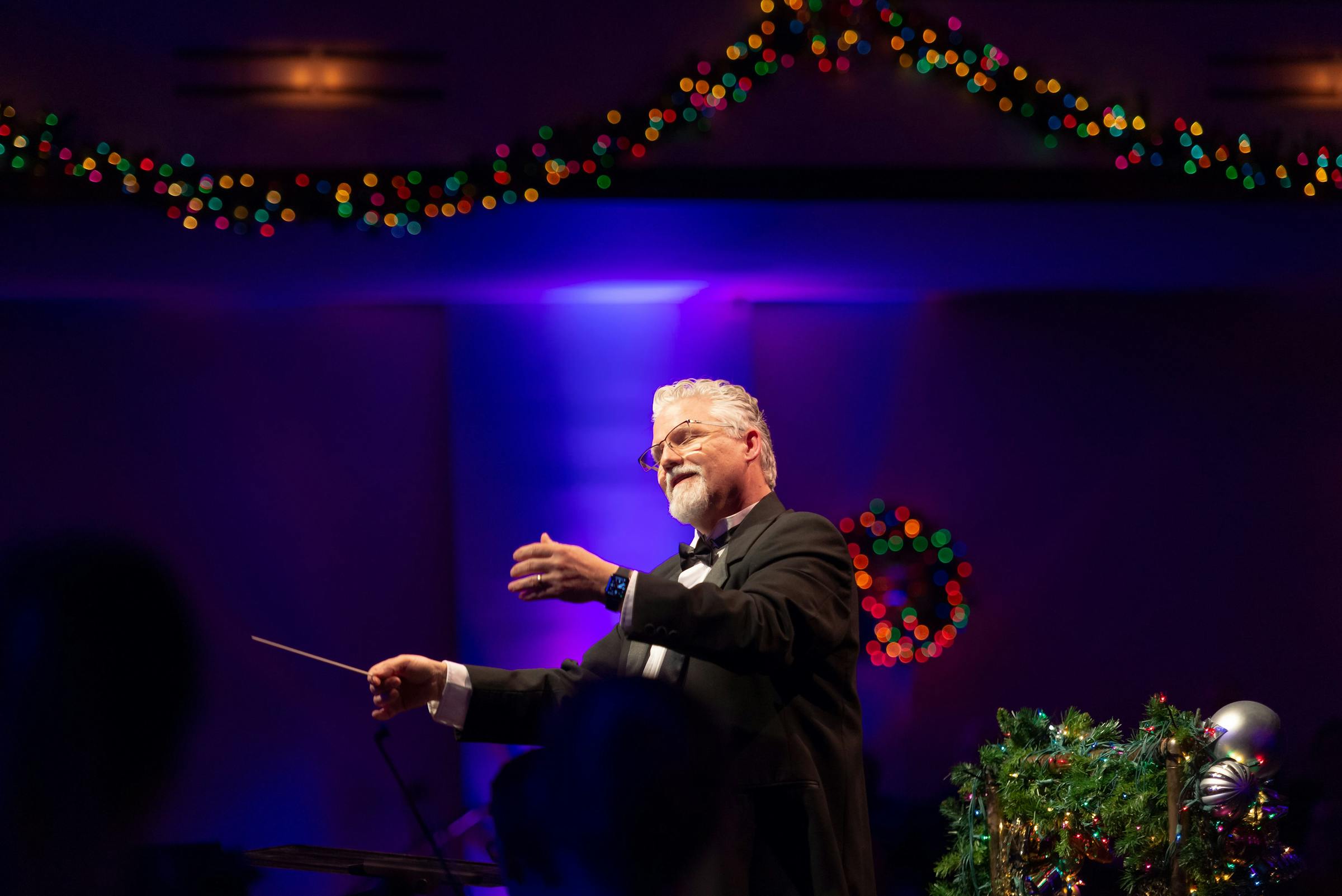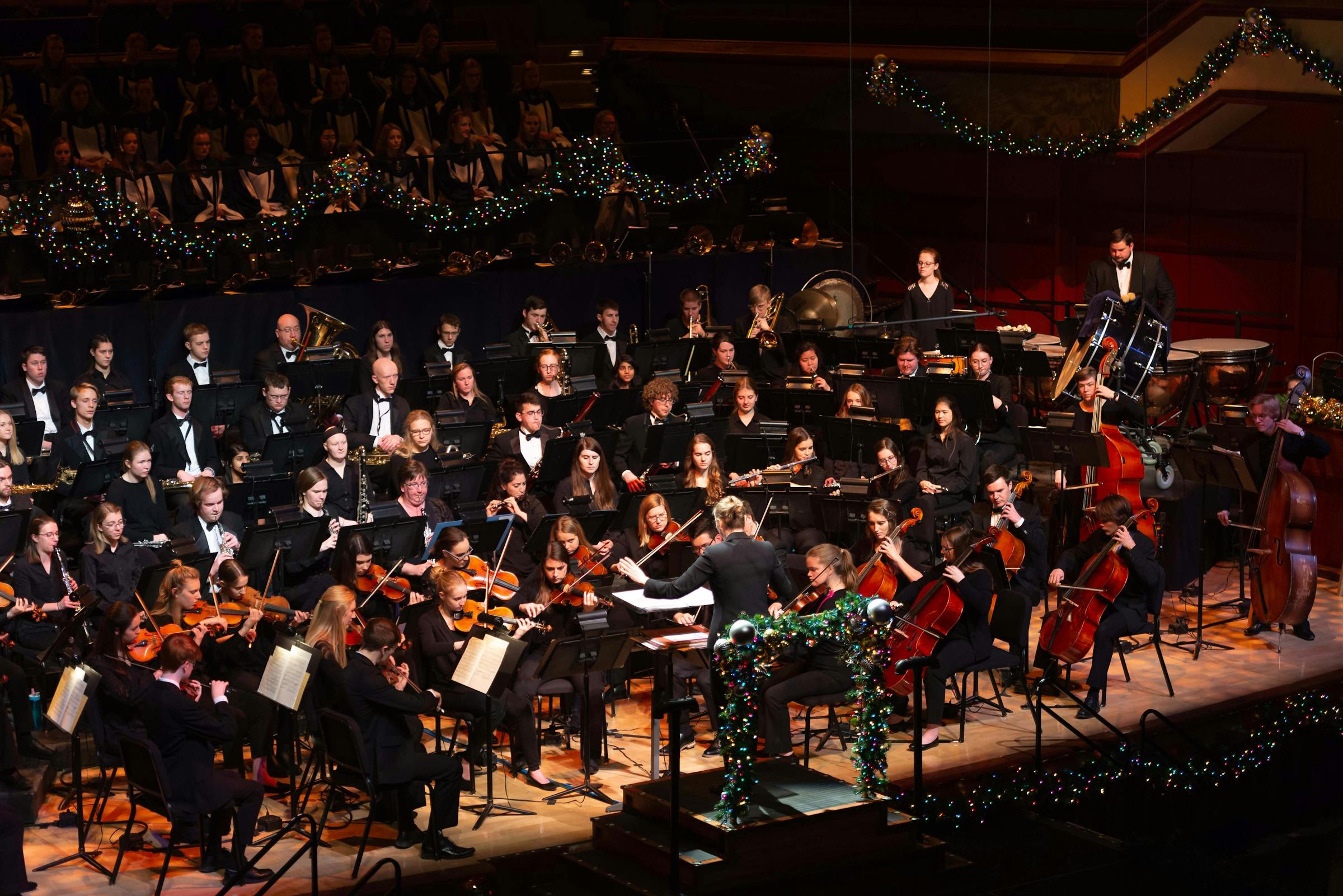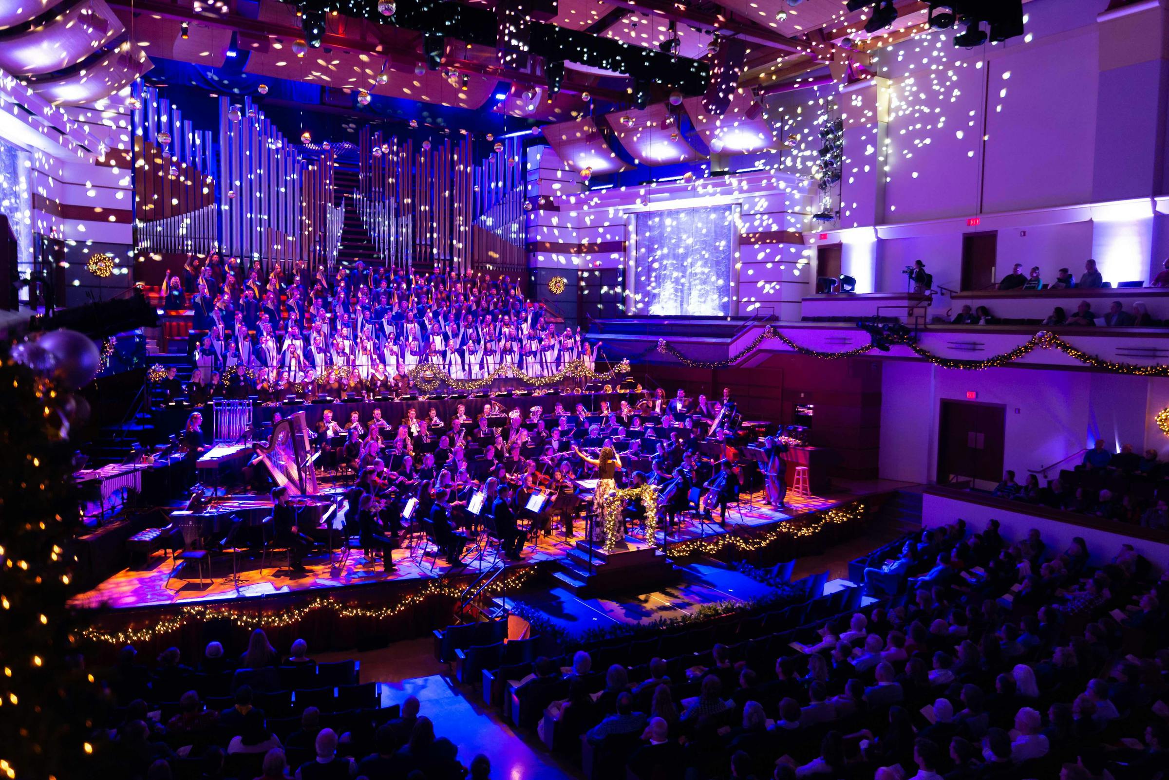 The organ, played by Music and Theatre Office Coordinator Cindy Reents, greeted the audience as they entered a Benson Great Hall decorated with garlands, lights, and bows. As people chatted with friends and family and read through the program, both the wind symphony and orchestra prepared their instruments. President Jay Barnes welcomed everyone for his last Festival of Christmas as president, but he promised that the performance was not about him and his wife, Barb, but about Jesus. “For this all begins and ends with Him,” he said.