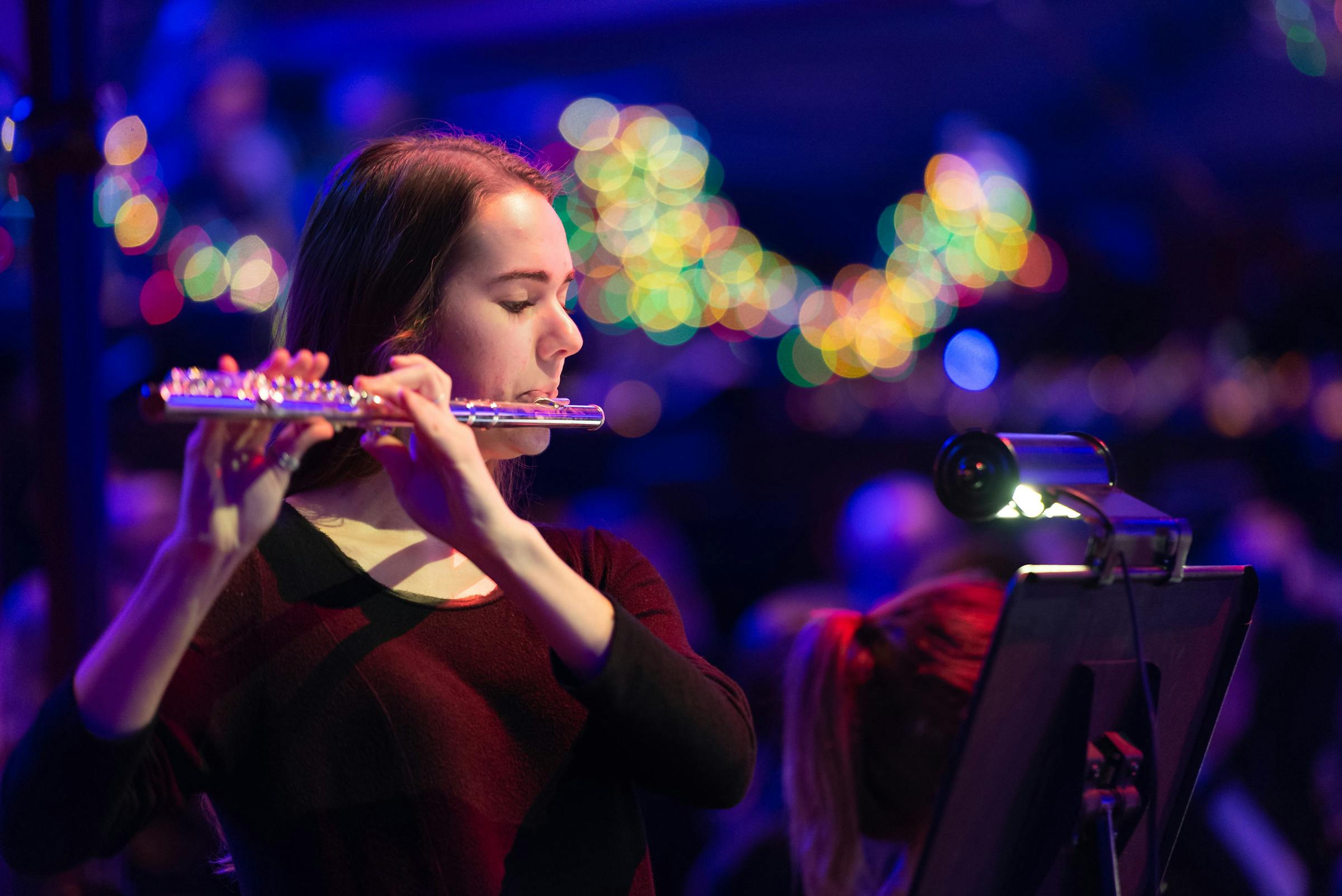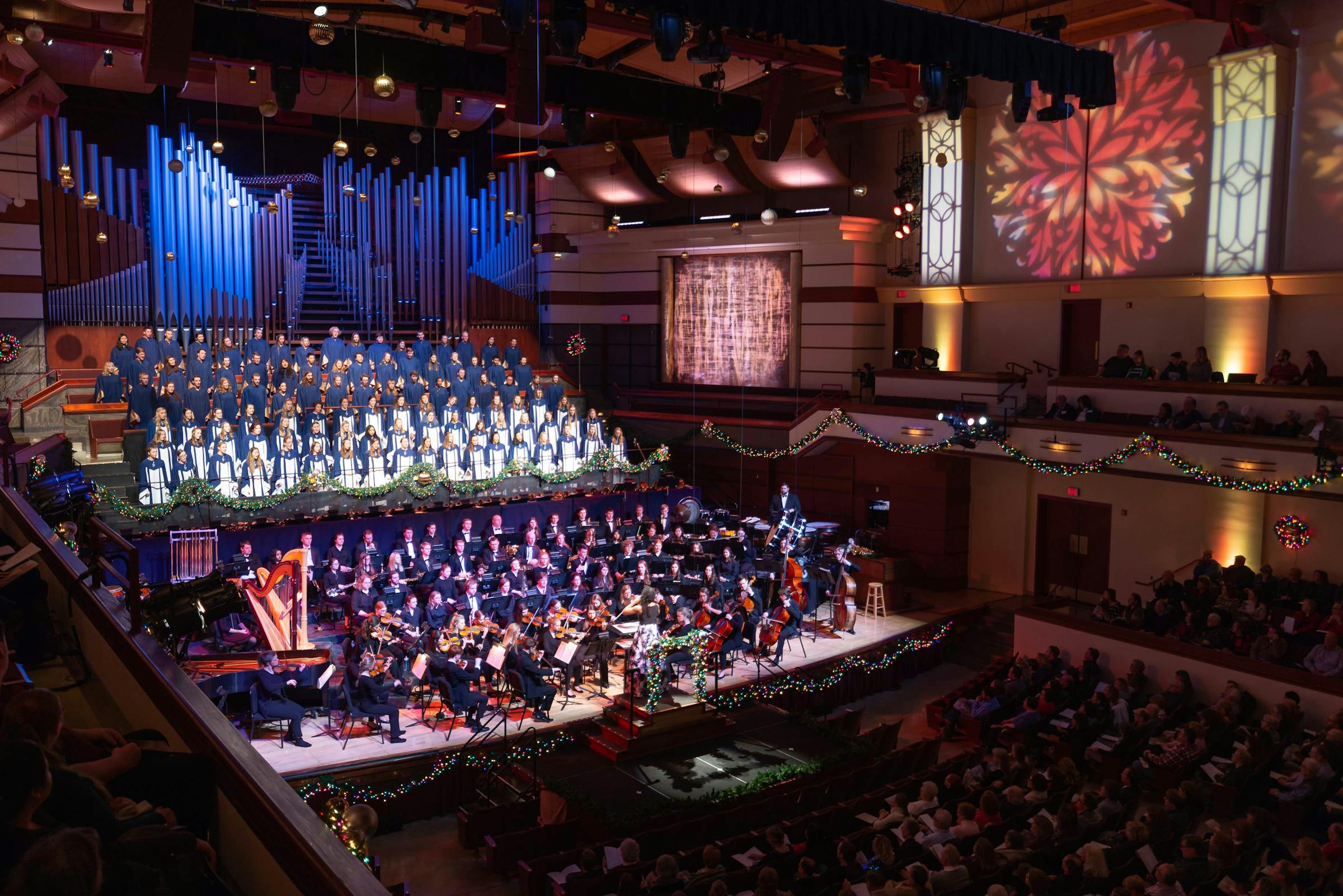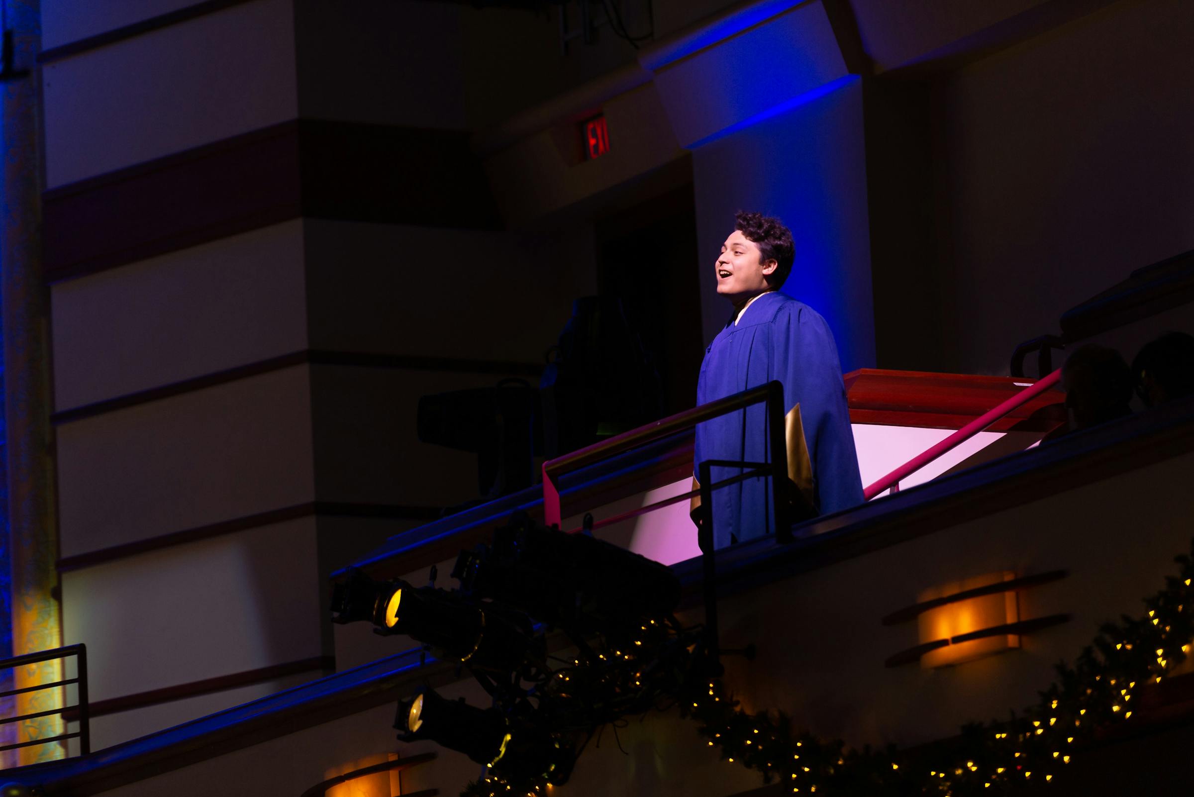 The organ, played by Music and Theatre Office Coordinator Cindy Reents, greeted the audience as they entered a Benson Great Hall decorated with garlands, lights, and bows. As people chatted with friends and family and read through the program, both the wind symphony and orchestra prepared their instruments. President Jay Barnes welcomed everyone for his last Festival of Christmas as president, but he promised that the performance was not about him and his wife, Barb, but about Jesus. “For this all begins and ends with Him,” he said.