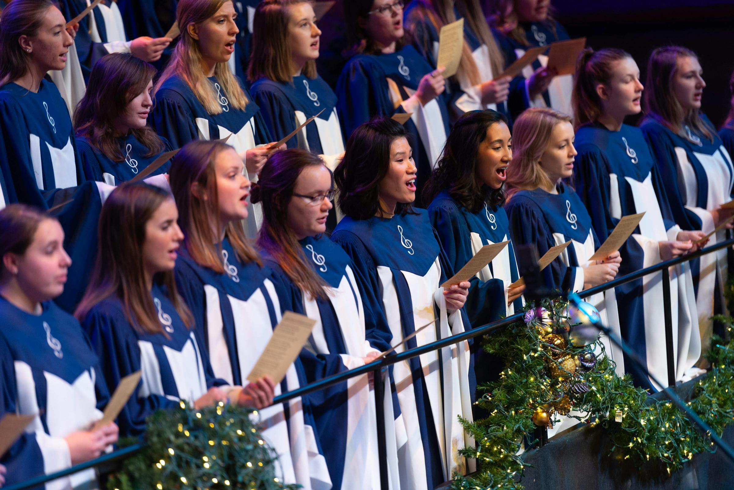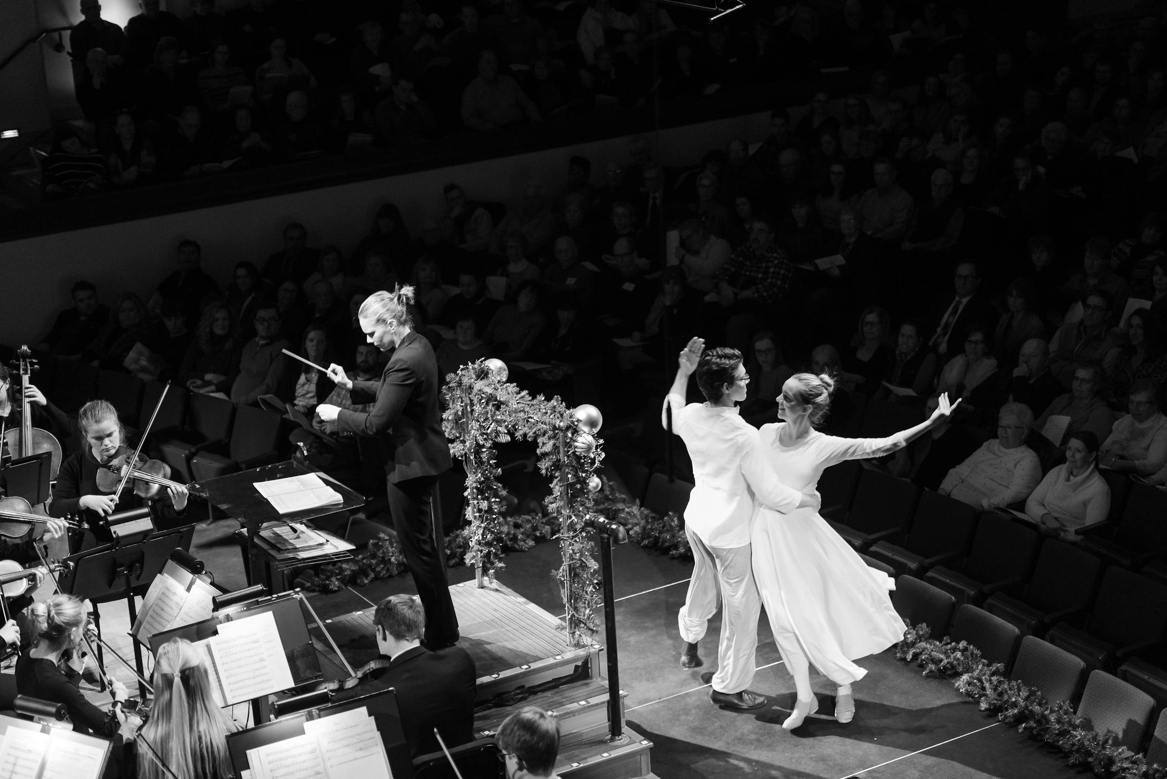 The program celebrated many aspects of music and honored the work each individual contributed—from the ushers who welcomed hundreds of people to the soloists who hit impossible notes. This year’s performance included dancers Laura Clark ’23 and Joshua Vana ’23, who performed Professor of Theatre Meg Zauner’s choreography during three pieces, adding another visual element to the program. Theatre students Hannah Joy Peterson ’20 and Katherine Juul Nevins—also a professor of psychology—read Scripture throughout the performance.