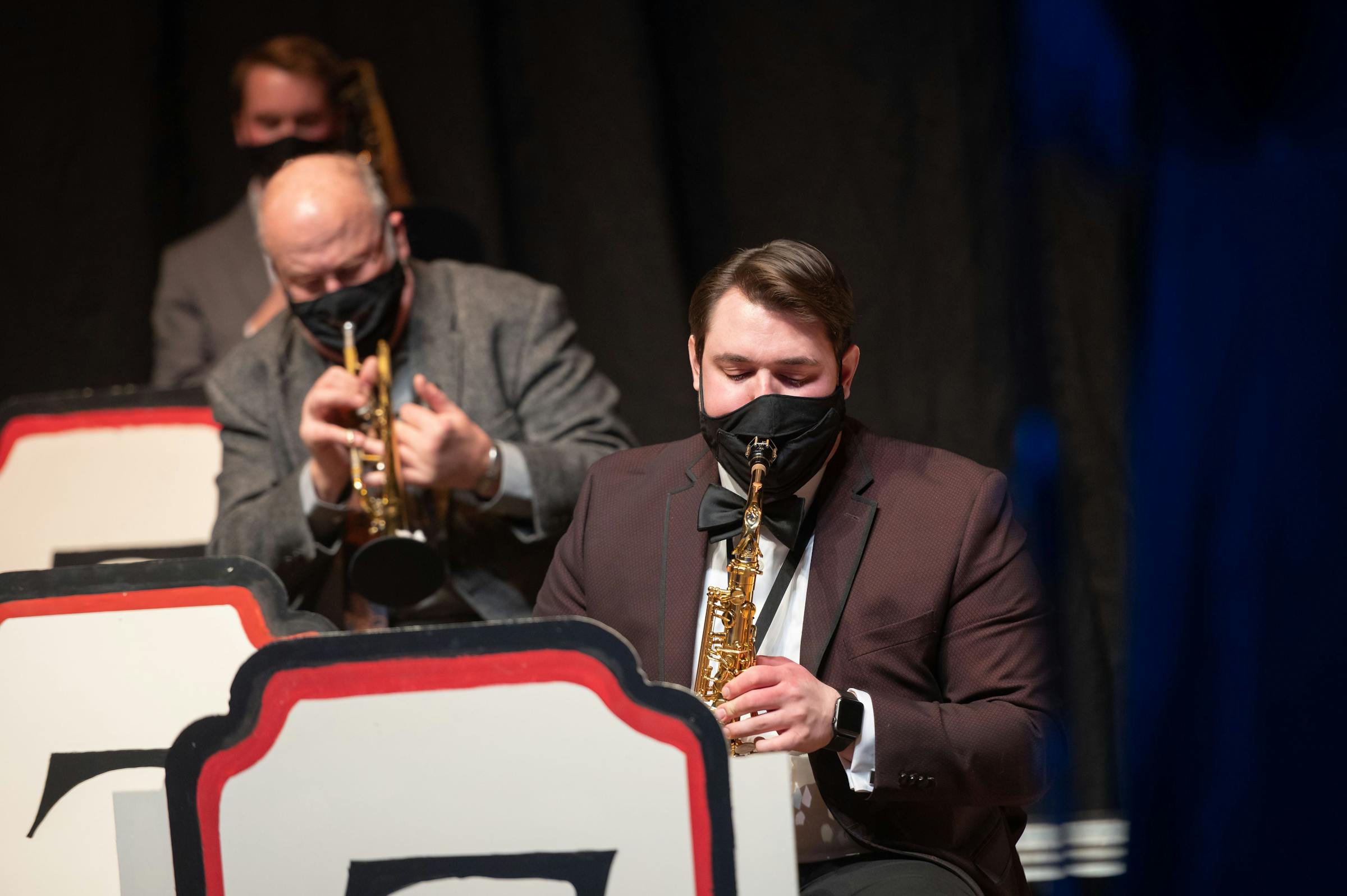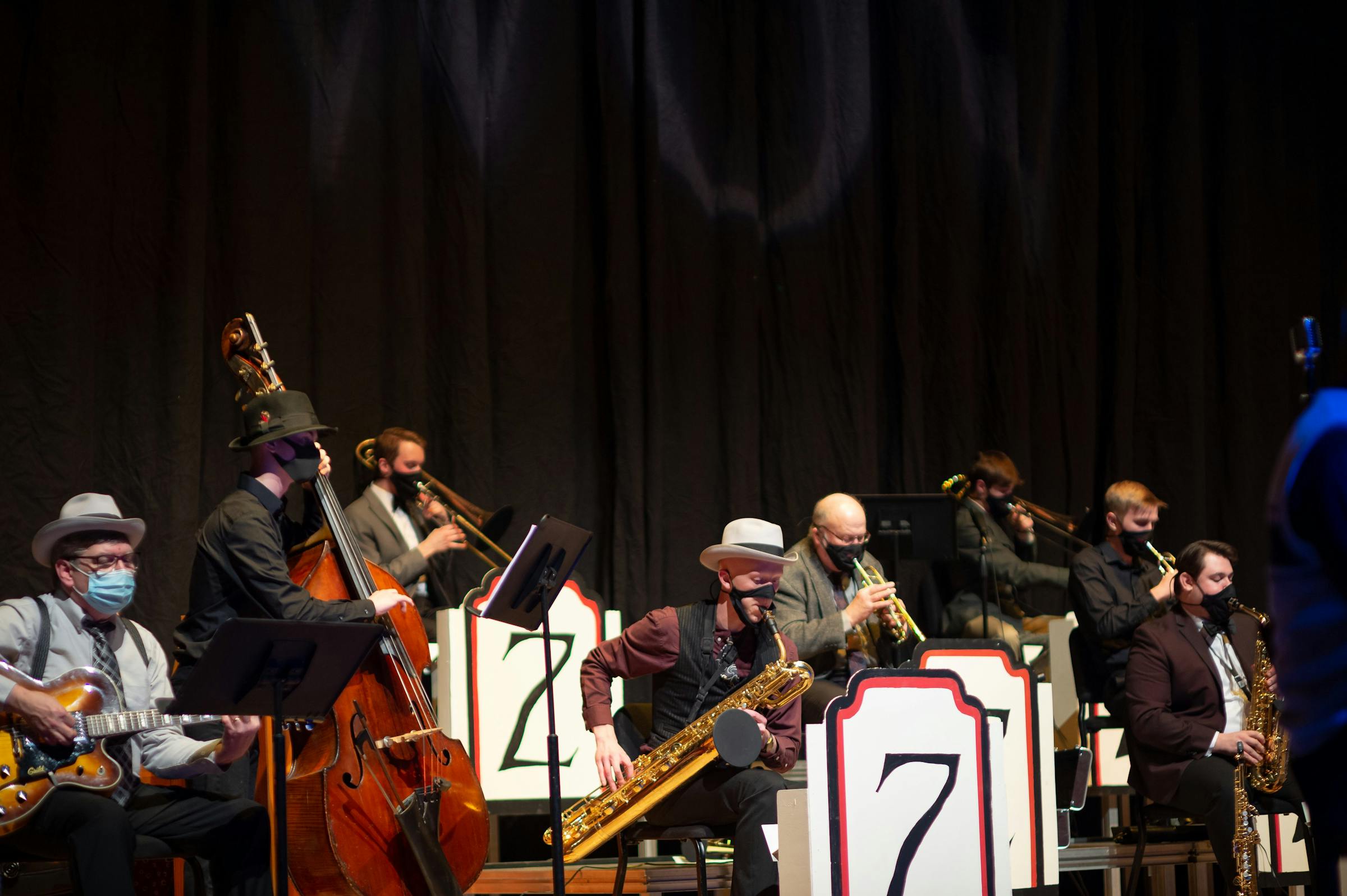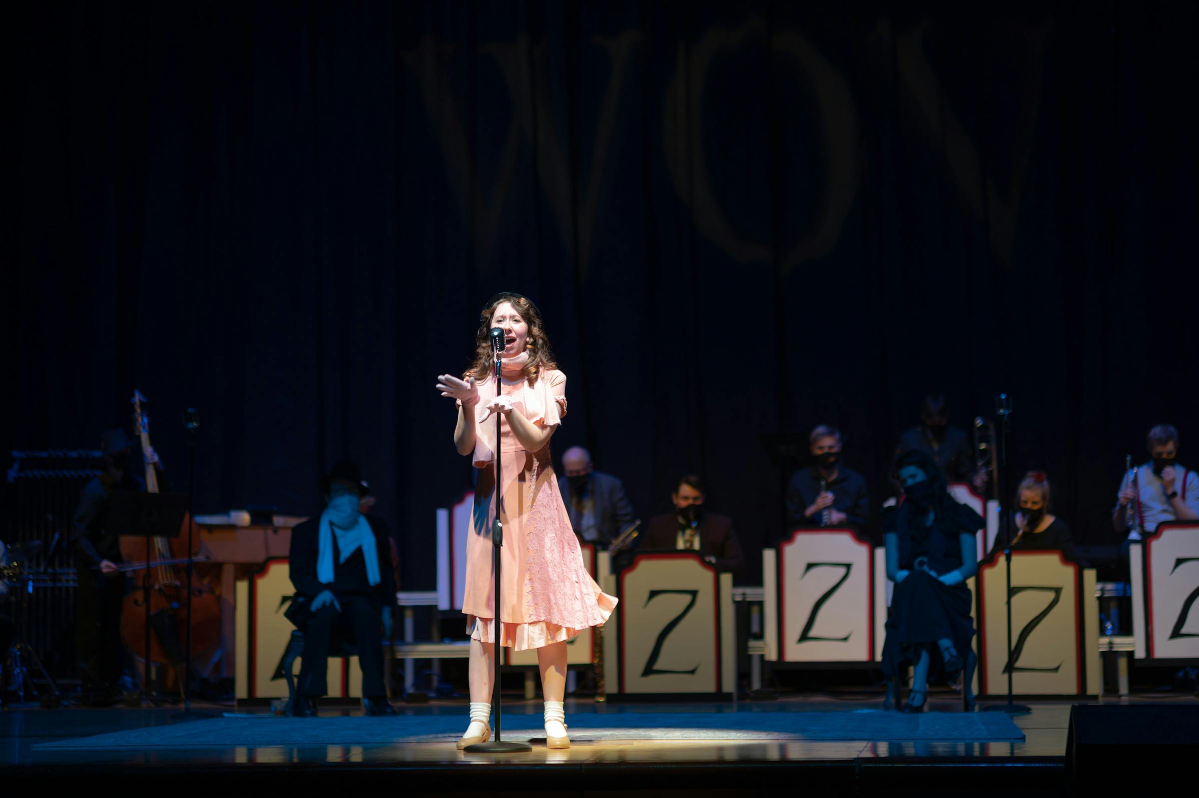 The live audience was possible due to the production’s creativity and commitment to safety. Instead of grouping around one microphone, each of the seven singers were given their own 1940s mic staged at least 6 feet apart. Audience members were required to use face coverings, and the musicians wore masks and covered their instruments accordingly. A line insinuated that the radio studio was cold, so the actors wrapped scarves around their faces. There was no intermission, and understudies were prepared to sing major songs in case an actor was required to quarantine. Director and choreographer Meg Zauner decided not to create a set so they’d have about 20 more feet on stage to block movements according to social distance guidelines.