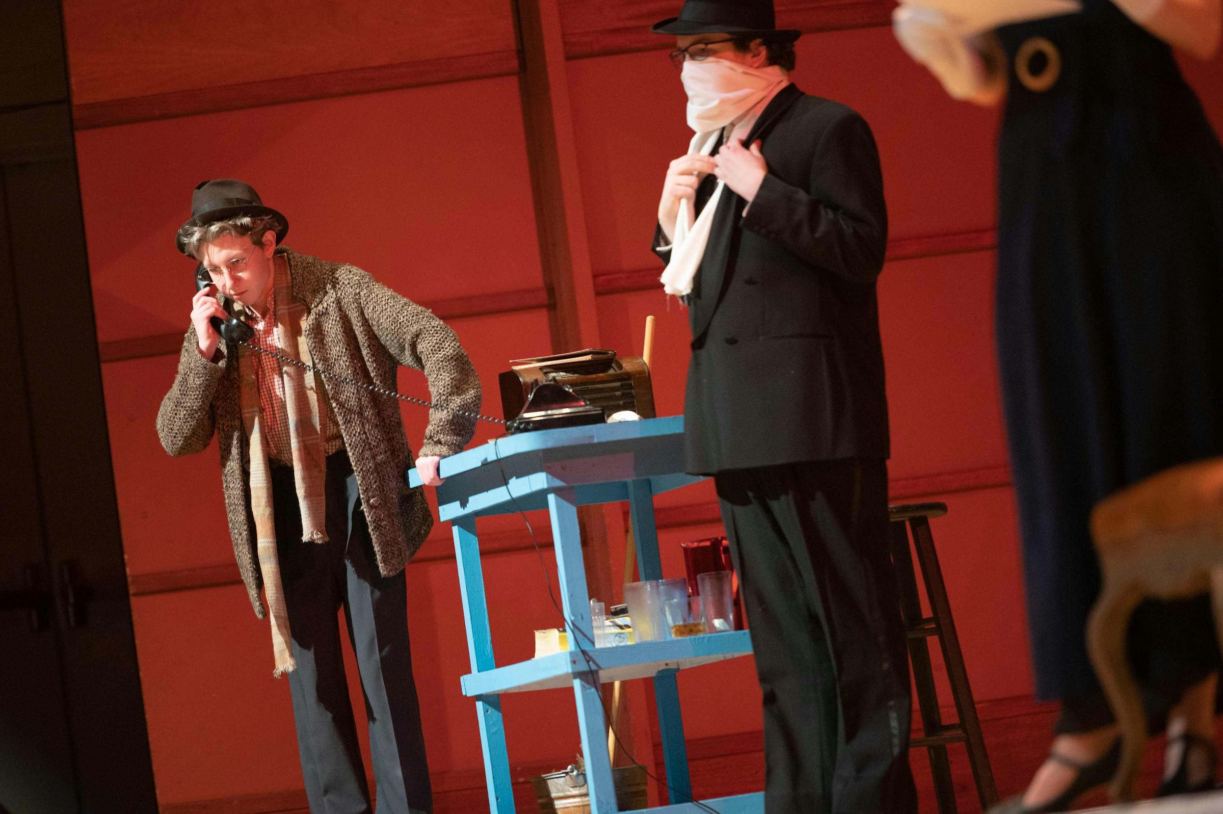 Despite adjusting the performance in some significant ways, Zauner was confident the actors would still convey the heart of the play. “We kept reminding them that ’40s music is about telling stories,” Zauner says. “You’re not just singing pretty notes. You’re telling stories.” She encouraged the singers to contemplate the lyrics in a new way and sing to emphasize their meaning rather than the melody. Because the musical was a class, she gave assignments for the actors to research the era’s colloquialisms and radio commercials so they could perform the jingles accurately.